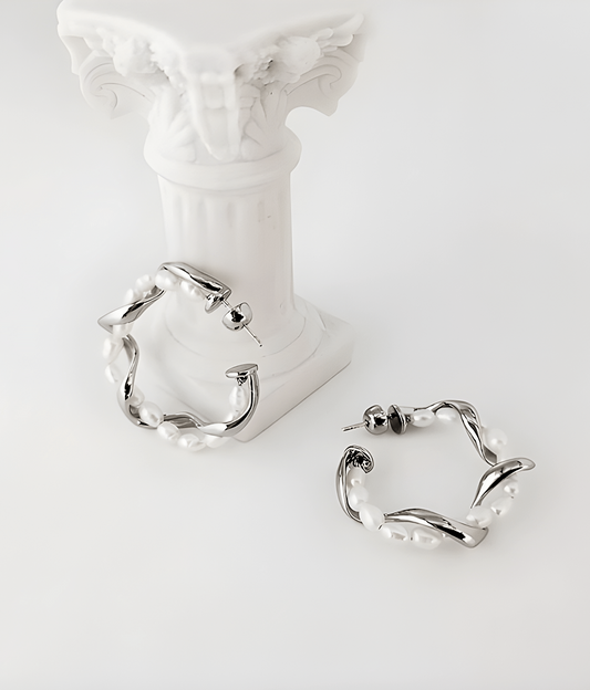 Silver Molten Baroque Pearl Twisted Hoop Earrings