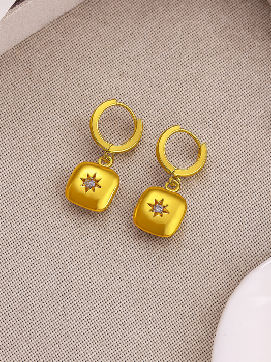 18KT Gold-Plated Puff Square Shape Star Zircon Drop Hoop Earrings