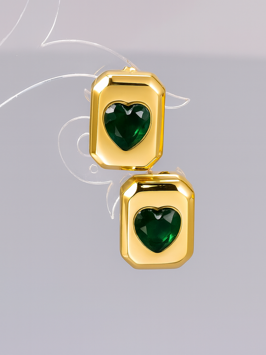 18KT Gold-Plated Square Heart Shape Emerald Rhinestones Stud Earrings