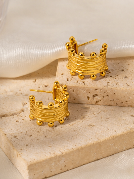 18KT Gold-Plated Textured Bead Dot "C" Shape Hoop Earrings